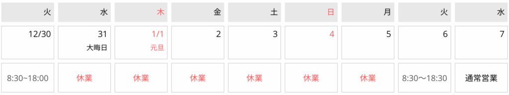 誠に勝手ながら、12月31日〜1月5日まで年末年始休業とさせていただきます